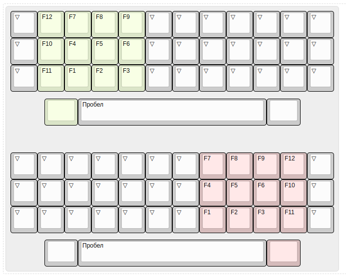 Пока китаец изготавливает мне плату и я ленюсь продолжать работу над корпусом, расскажу о планируемой раскладке для этой клавиатуры. Собственно, эту раскладку я использую на практически всех своих клавиатурах, которые поддерживают QMK (проводные) или ZMK (блютус). Пикрилейтед картинка изготовлена с помощью keyboard-layout-editor.com.